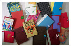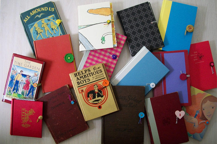 "Pocket Journals" are made from vintage book covers to hold a notebook and pen; there are pockets inside for coupons, shopping lists, business cards, and the like